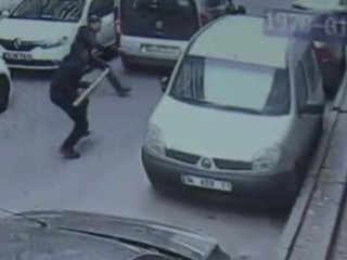 Bu sırada apartmanın birinci katından apartman sakinleri ev sahibi ve vatandaşa sopa uzattı. Ellerindeki sopalarla hırsızları bekleyen ev sahibi, çıkan hırsızlara sopayla vurmaya çalıştı. Bu sırada bir hırsız, ev sahibinin elindeki sopayı kaptı. İlk önce ev sahibine sopayla saldıran şahıs, ardından diğer vatandaşa yöneldi.