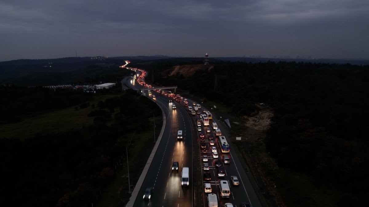 Yaklaşık 8 kilometreyi bulan trafik yoğunluğu, drone kamerasıyla havadan görüntülendi.