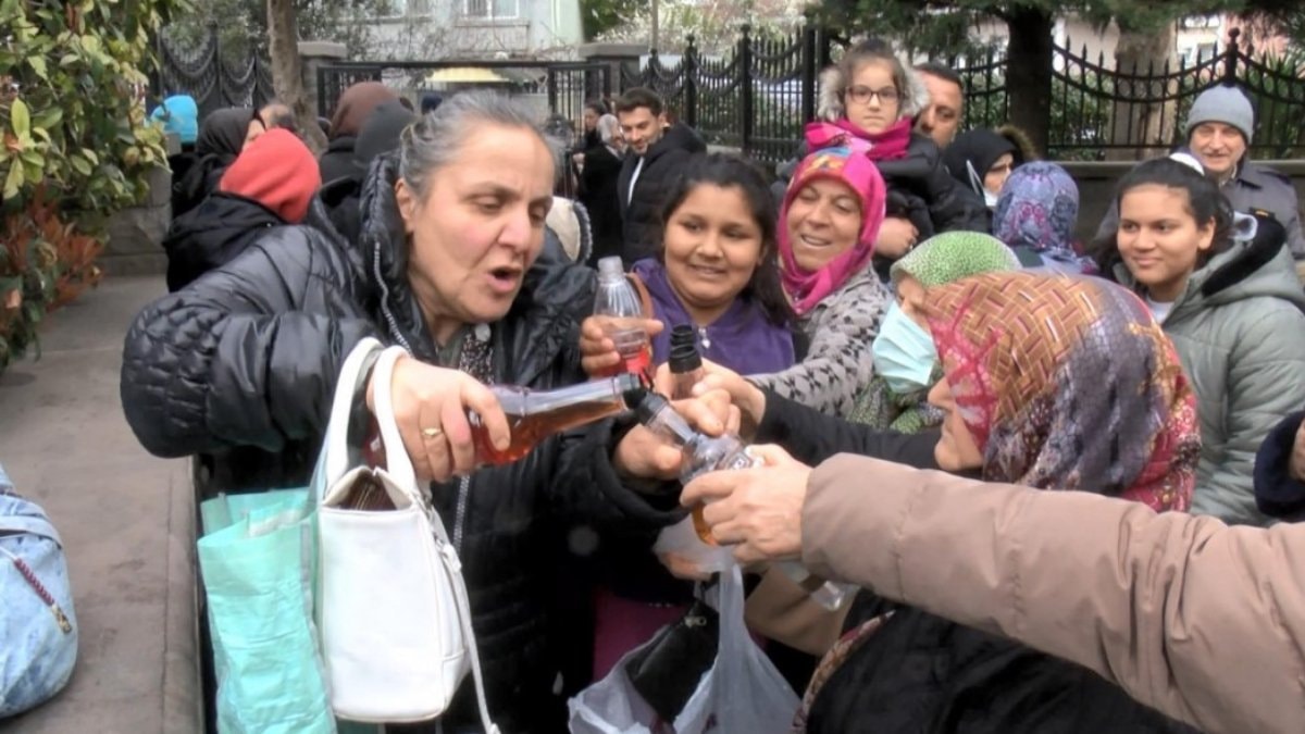 Türbeye ilk kez geldiğini belirten Çiğdem Ateş, "Annem ve yeğenlerimle geldim. Sirke getirdim, dağıttım ve insanlardan aldım. Bu sirkeyi bir yıl kullanmamız gerekiyormuş. Bu sene en çok ülkemizde bir daha böyle bir deprem felaketi yaşanmasın diye dua ettim" dedi.