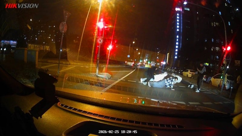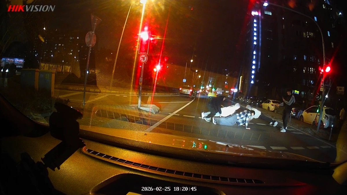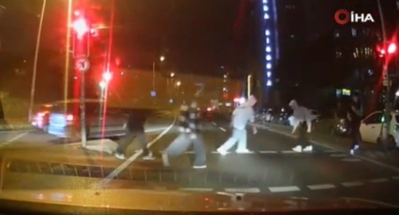 Gençlerin kırmızı ışık süresince gerçekleştirdiği bu aktivite, o sırada ışıkta bekleyen bir otomobilin araç kamerası tarafından kaydedildi.