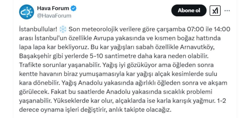 Paylaşımda, "Son meteorolojik verilere göre çarşamba 07:00 ile 14:00 arası İstanbul'un özellikle Avrupa yakasında ve kısmen boğaz hattında lapa lapa kar bekliyoruz. Bu kar yağışları sabah özellikle Arnavutköy, Başakşehir gibi yerlerde 5-10 santimetre daha kara neden olabilir." denildi.