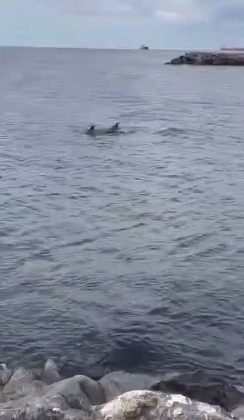 İstanbul'da Küçükçekmece Menekşe Sahili'nde öğle saatlerinde yunuslar sahile yakın noktalarda ortaya çıktı.