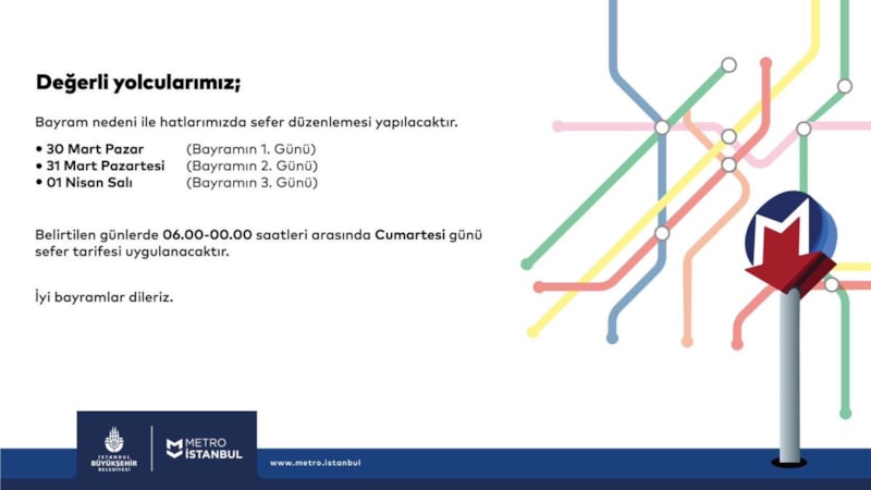 İstanbul'da, Ramazan Bayramı dolayısıyla 30 Mart-1 Nisan arasında metro seferleri 06.00-00.00 saatleri arasında yapılacak.