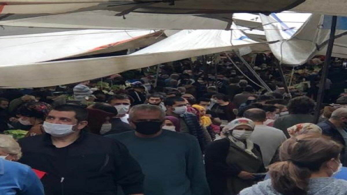 Koronavirüs ölemleri kapsamında toplu alanlarda sosyal mesafe kurallarına uyma uyarıları, pazar yerlerinde dikkate alınmıyor.