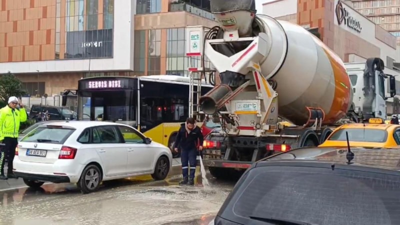Gündüz saatlerinde cadde üzerinde kırmızı ışıkta bekleyen beton harcı taşıyan mikser aracı yola harçtan döktü.