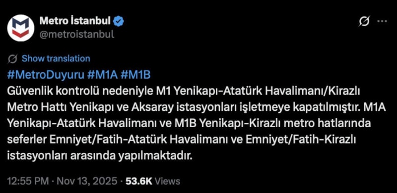 “Güvenlik kontrolü nedeniyle M1 Yenikapı-Atatürk Havalimanı/Kirazlı Metro Hattı Yenikapı ve Aksaray istasyonları işletmeye kapatılmıştır. M1A Yenikapı-Atatürk Havalimanı ve M1B Yenikapı-Kirazlı metro hatlarında seferler Emniyet/Fatih-Atatürk Havalimanı ve Emniyet/Fatih-Kirazlı istasyonları arasında yapılmaktadır.”