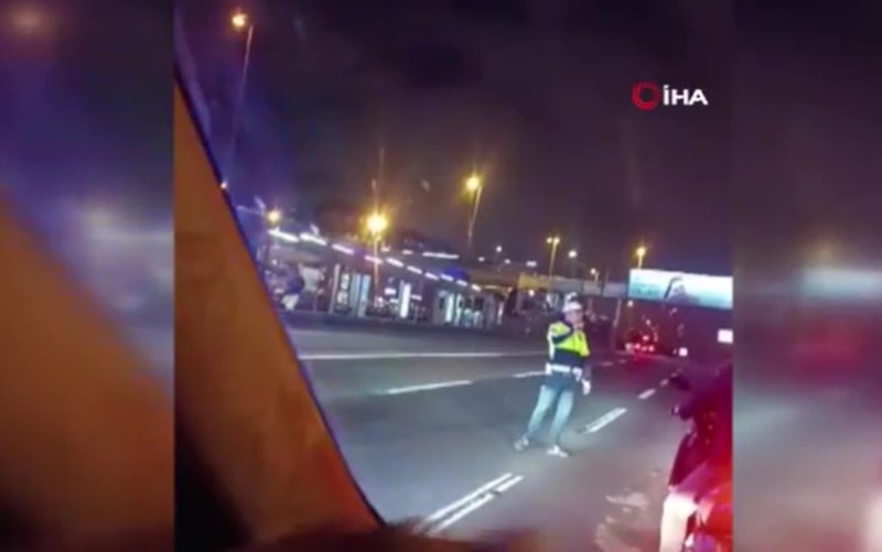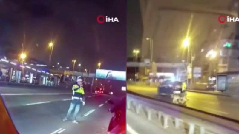 Polislerden biri trafiği durdururken, diğer polis köpeği karışa geçirdi. O anlar cep telefonu kamerasına yansıdı.