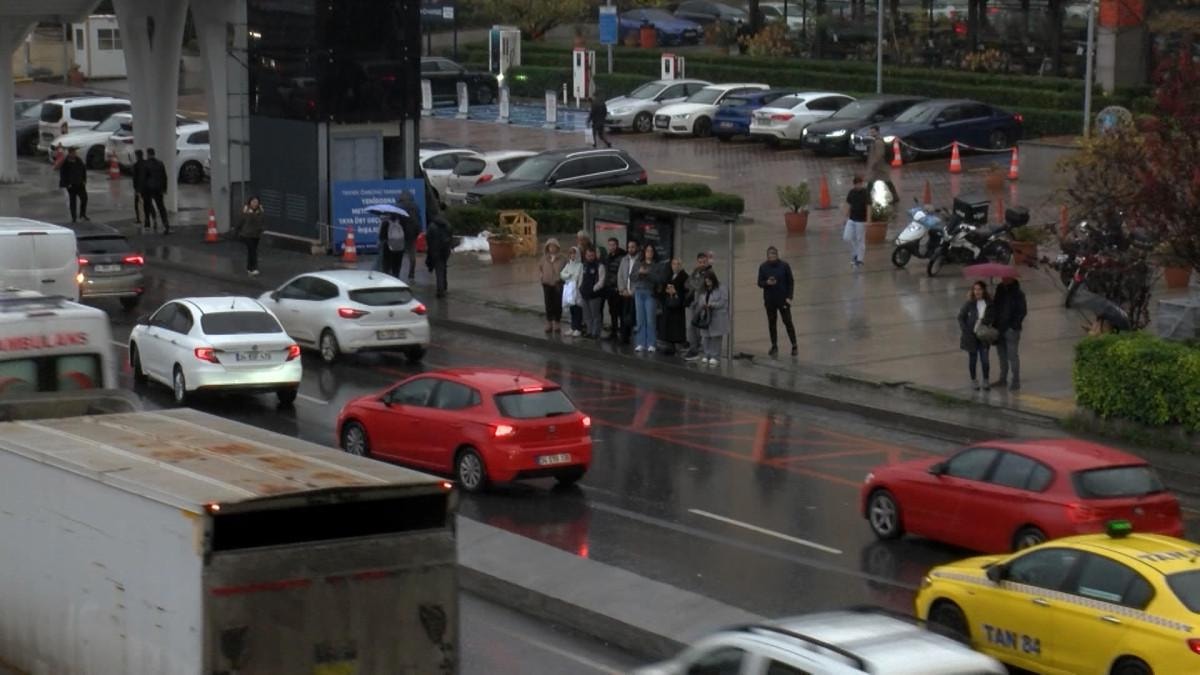 Bazı kişilerin şemsiyeleriyle yağmurdan korunduğu görülürken bazı kişiler ise otobüs duraklarına sığındı.