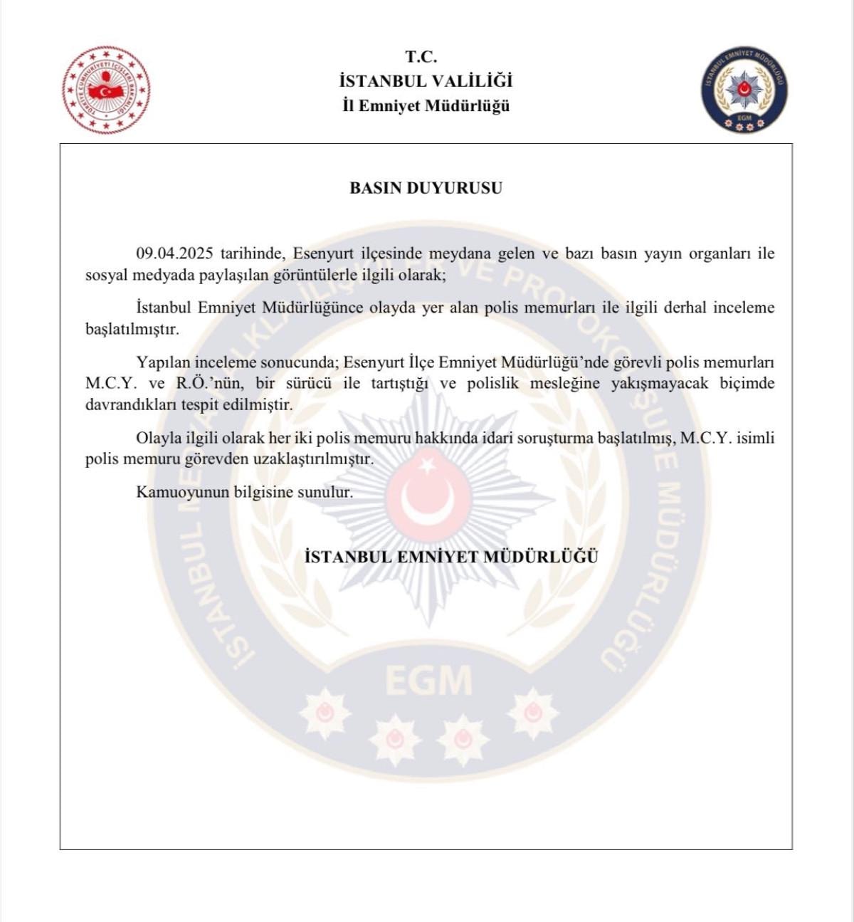 Yapılan inceleme sonucunda; Esenyurt İlçe Emniyet Müdürlüğü'nde görevli polis memurları M.C.Y. ve R.Ö.'nün, bir sürücü ile tartıştığı ve polislik mesleğine yakışmayacak biçimde davrandıkları tespit edilmiştir. Olayla ilgili olarak her iki polis memuru hakkında idari soruşturma başlatılmış, M.C.Y. isimli polis memuru görevden uzaklaştırılmıştır."