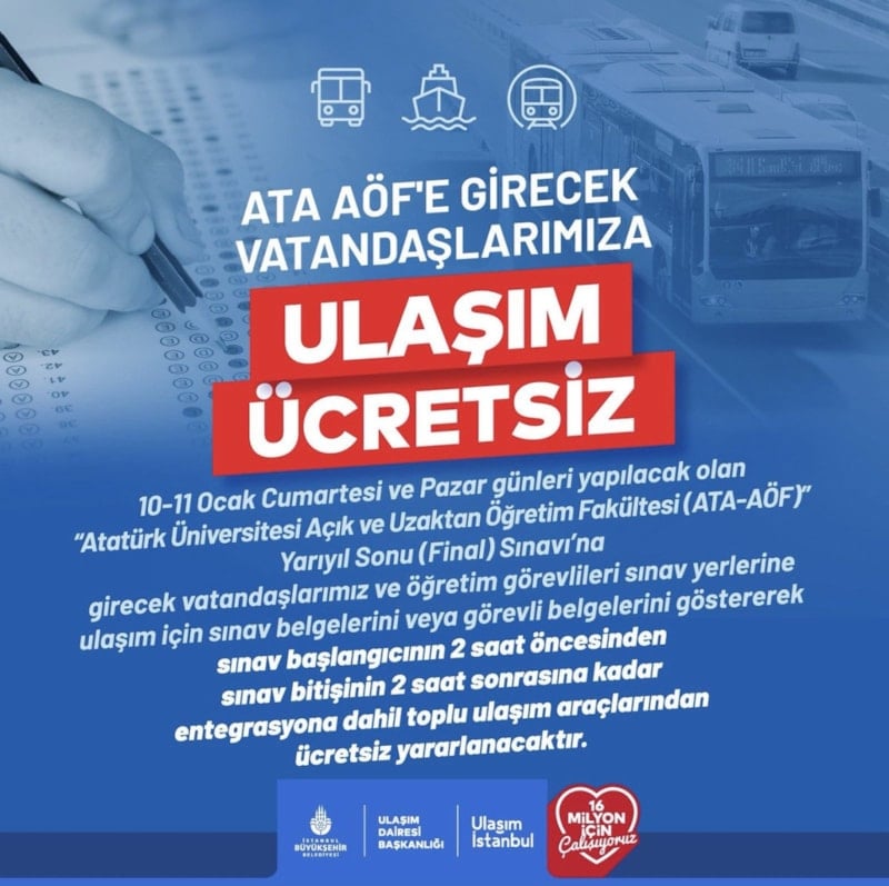 İstanbul’da Atatürk Üniversitesi Açık ve Uzaktan Öğretim Fakültesi sınavları sebebiyle bugün ve yarın belirli saatlerde ulaşım ücretsiz olacak. İşte ücretsiz ulaşımın geçerli olduğu saatler…