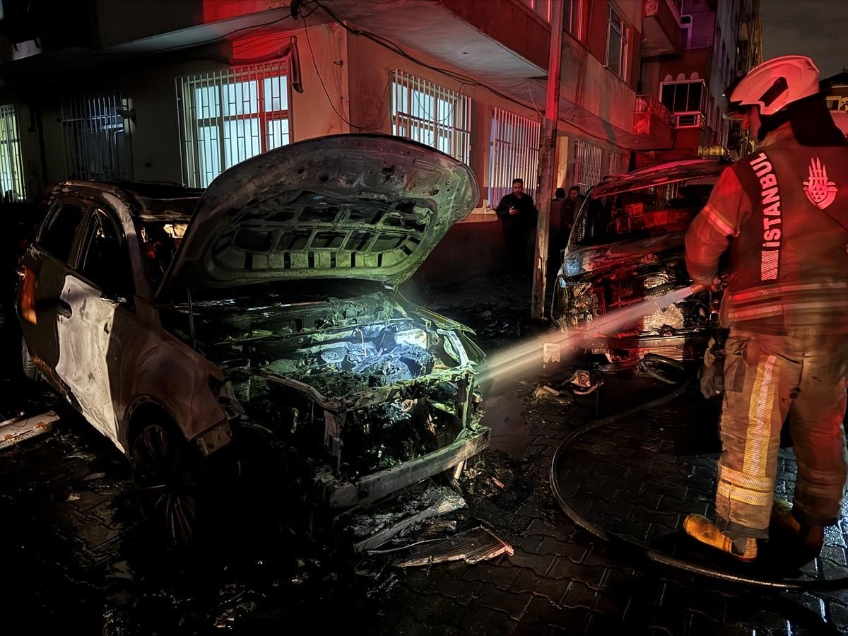 İstanbul'da Bahçelievler'de Hürriyet Mahallesi İkizler Sokak'ta park halindeki otomobiller, henüz bilinmeyen nedenle yanmaya başladı.
