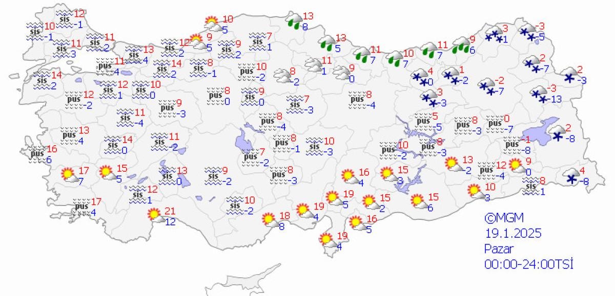 Meteoroloji Genel Müdürlüğü, 19 Ocak Pazar günü için hava tahmin raporunu yayımladı.