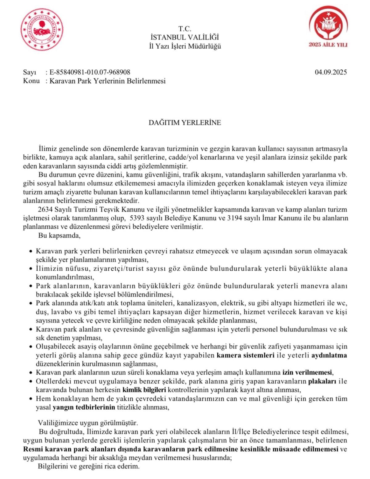 - İstanbul Valiliği, karavanların sahil, cadde kenarı ve yeşil alanlara park etmelerini yasakladı.
