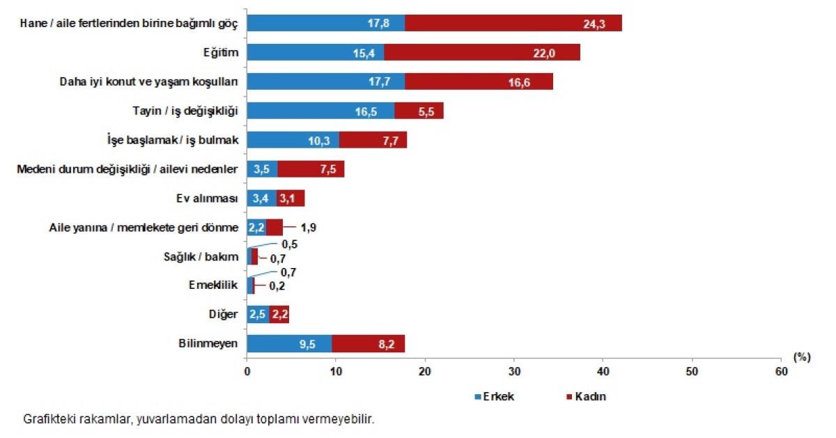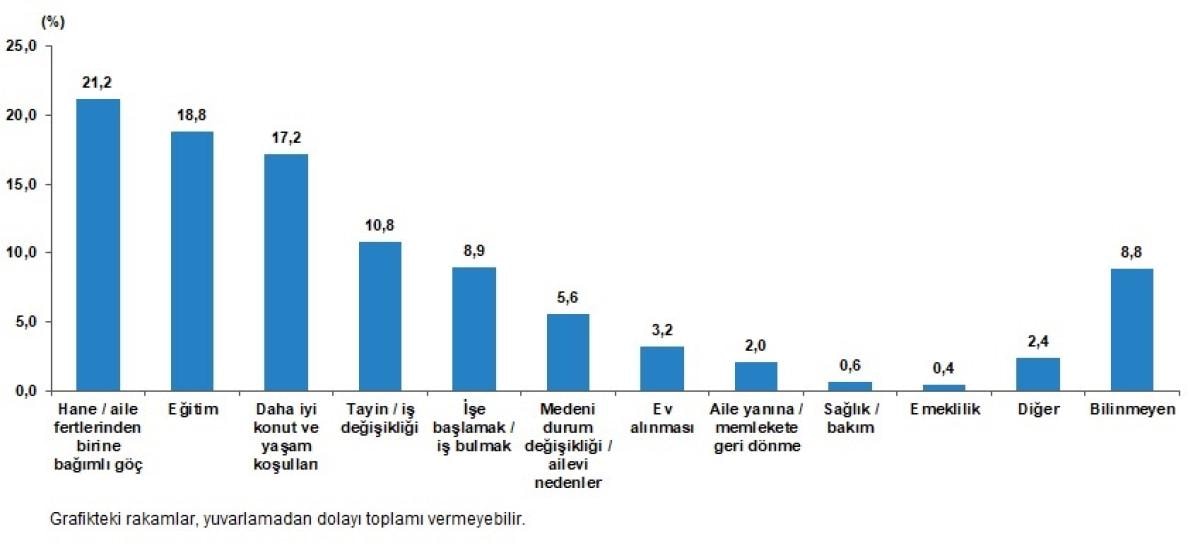 Verilere göre İstanbul'dan göç edenlerin en büyük sebebi 'Hane/aile fertlerinde birine bağımlı göç.' 2022'de 95 bin kişi bu sebeple İstanbul'dan ayrıldı. Bu da sebeplerin yüzde 22,8'ine karşılık geliyor.