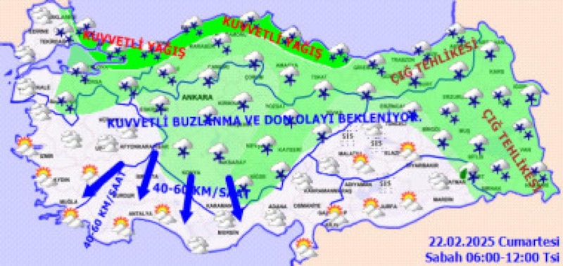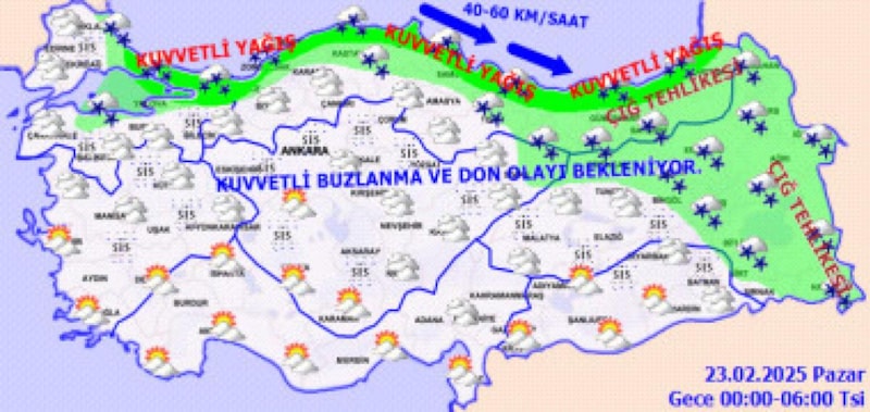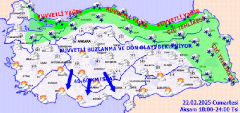 Kuzey, iç ve doğu kesimlerde kuvvetli olmak üzere Ülkemiz genelinde buzlanma ve don ile birlikte pus ve yer yer sis hadisesinin görüleceği tahmin ediliyor. Doğu Karadeniz’in iç kesimlerinin yüksekleri ile Doğu Anadolu’nun yüksek ve dik yamaçlarında çığ tehlikesi bulunuyor.