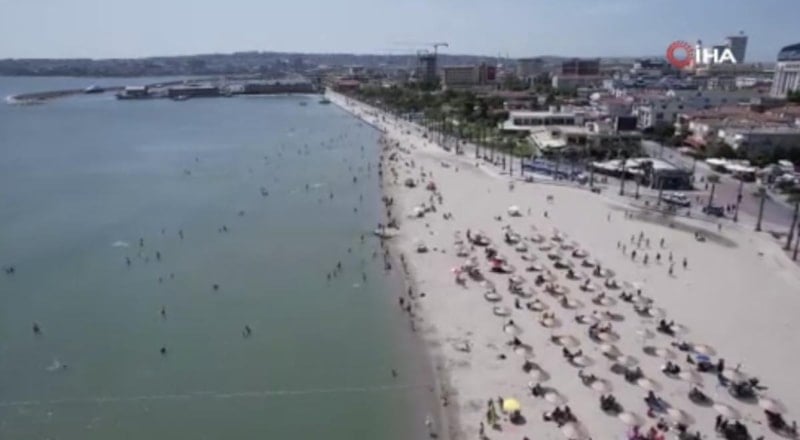 Büyükçekmece ve Küçükçekmece'de halk plajlarındaki yoğunluk, drone ile havadan da görüntülendi.
