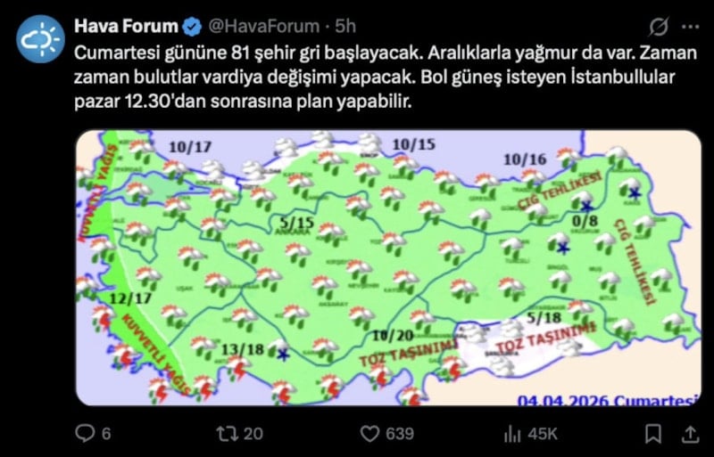 Paylaşımında, “Cumartesi gününe 81 şehir gri başlayacak. Aralıklarla yağmur da var. Zaman zaman bulutlar vardiya değişimi yapacak. Bol güneş isteyen İstanbullular pazar 12.30'dan sonrasına plan yapabilir.” sözlerine yer verdi.