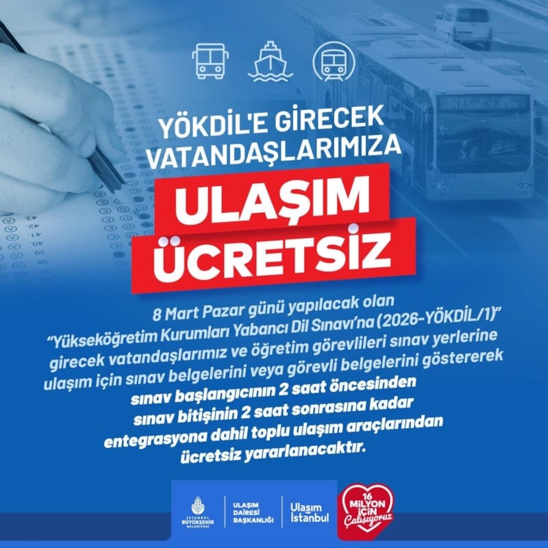Yapılan açıklamada 8 Mart Pazar günü yapılacak olan YÖKDİL sınavına girecek vatandaşlar ve öğretim görevlileri belgelerini göstererek ücretsiz ulaşım sağlayacak.