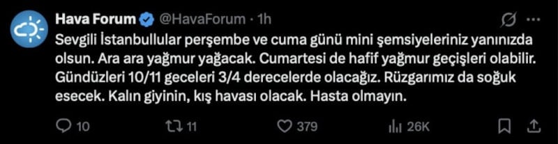 “Sevgili İstanbullular perşembe ve cuma günü mini şemsiyeleriniz yanınızda olsun. Ara ara yağmur yağacak. Cumartesi de hafif yağmur geçişleri olabilir. Gündüzleri 10/11 geceleri 3/4 derecelerde olacağız. Rüzgarımız da soğuk esecek. Kalın giyinin, kış havası olacak. Hasta olmayın.”