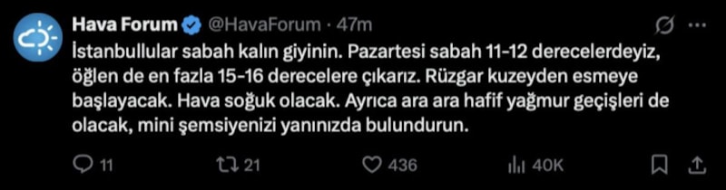 “İstanbullular sabah kalın giyinin. Pazartesi sabah 11-12 derecelerdeyiz, öğlen de en fazla 15-16 derecelere çıkarız. Rüzgar kuzeyden esmeye başlayacak. Hava soğuk olacak. Ayrıca ara ara hafif yağmur geçişleri de olacak, mini şemsiyenizi yanınızda bulundurun.”