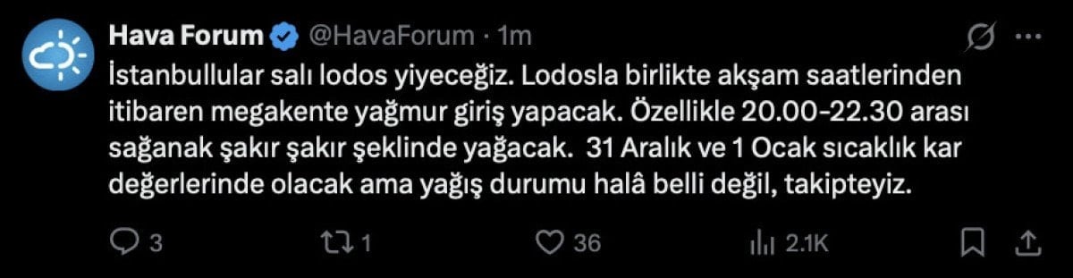 “İstanbullular salı lodos yiyeceğiz. Lodosla birlikte akşam saatlerinden itibaren megakente yağmur giriş yapacak. Özellikle 20.00-22.30 arası sağanak şakır şakır şeklinde yağacak. 31 Aralık ve 1 Ocak sıcaklık kar değerlerinde olacak ama yağış durumu halq belli değil, takipteyiz.”