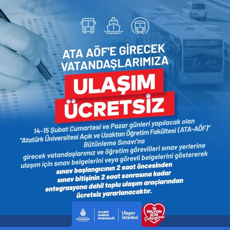 Atatürk Üniversitesi Açık ve Uzaktan Öğretim Fakültesi bütünleme sınavları nedeniyle hafta sonu toplu taşımada ücretsiz ulaşım uygulaması başlıyor. Ücretsiz ulaşımdan yararlanabilecek kişiler ve geçerli olacağı saat aralığı duyuruldu.