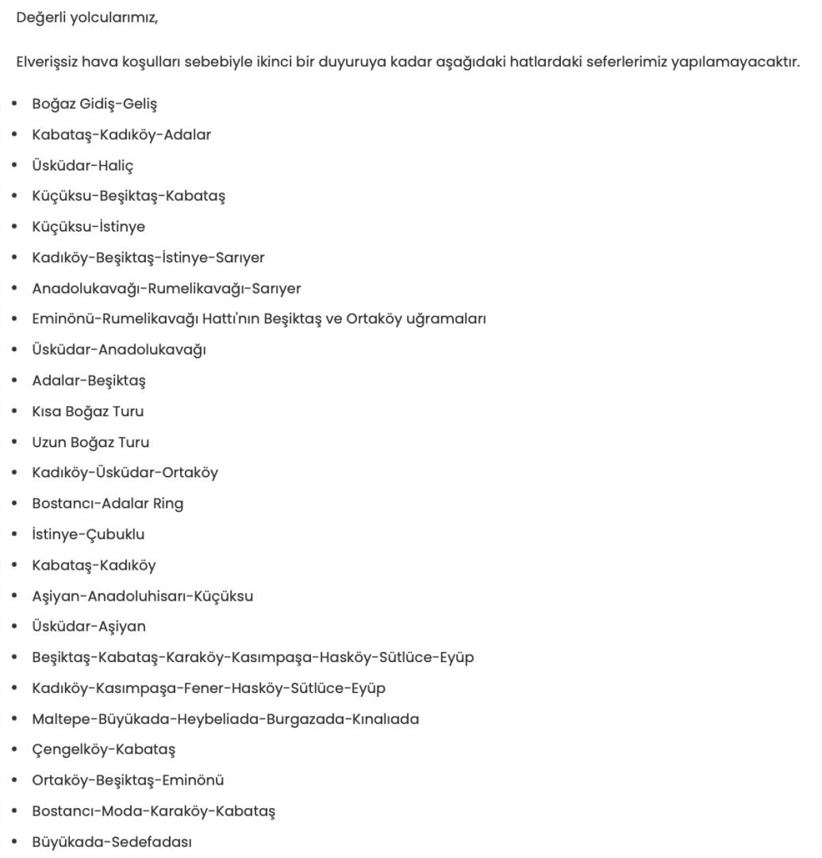 Şehir Hatları A.Ş., olumsuz hava koşulları nedeniyle kent genelindeki tüm vapur seferlerinin ikinci bir duyuruya kadar durdurulduğunu açıkladı.