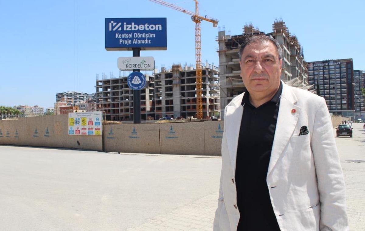 Burası, İzmir Büyükşehir Belediyesinin kentsel dönüşüm adı altında İZBETON tarafından kooperatifler kurdurularak yapılan bir inşaat. Biz burayı meclis kararı ile İZBETON’a vermiştik; ancak daha sonra tamamen hukuk dışı olarak İZBETON burayı kat karşılığı olarak bir kooperatife verdi. Kooperatifler de insanları üye yaparak inşaata başladı. 3 yıldır yapılması gereken işin bu şekilde olmaması gerektiğini söylüyorduk. Sistemin yanlış olduğunu anlattık. Burada en büyük mağdur, kooperatifin üyeleri olacak. Belki yarın bu konutlar yıkılacak. İzmir Büyükşehir Belediyesi tarafından yapılan imalat hataları olursa yarın öbür gün Çevre, Şehircilik ve İklim Değişikliği Bakanlığı denetlediğinde yıkım kararı çıkar. Bu para yine vatandaştan çıkacak. Bunu hep söyledik; ama bizi dinlemediler. Kooperatifin kurucu başkanı da CHP İzmir İl Başkanı Şenol Aslanoğlu.