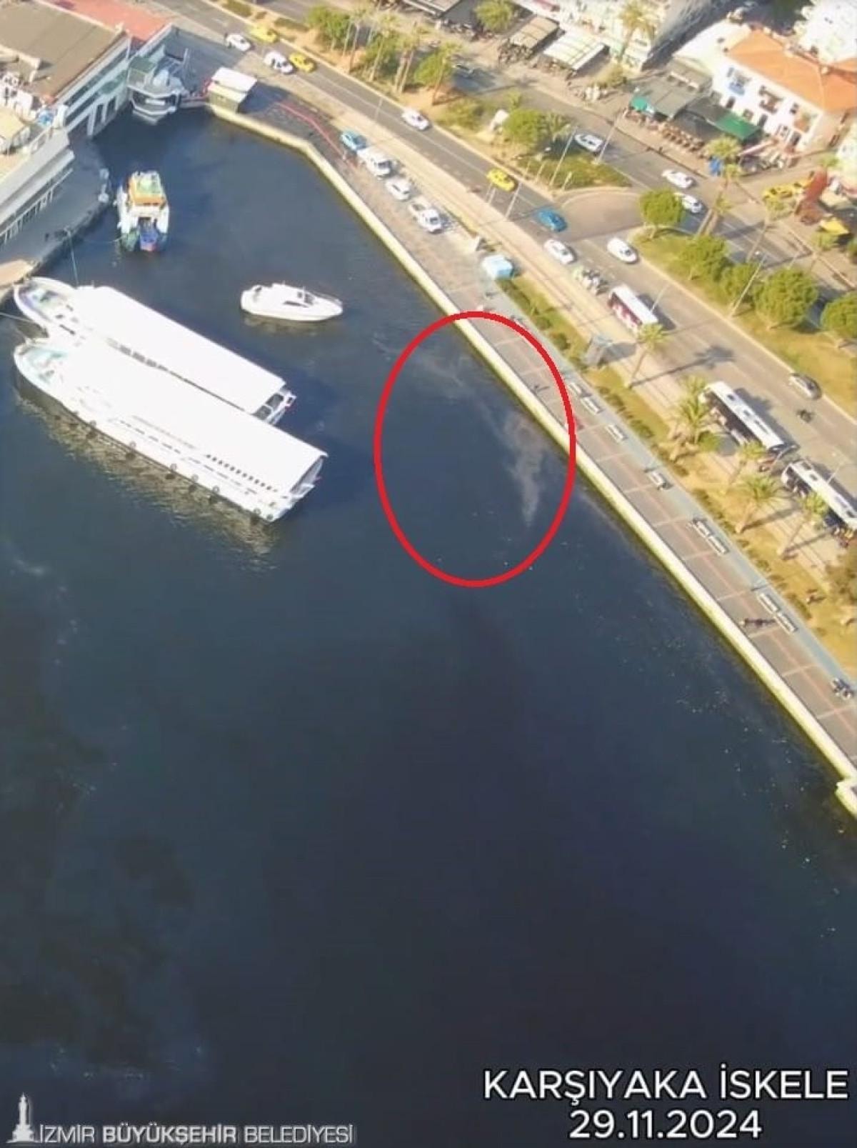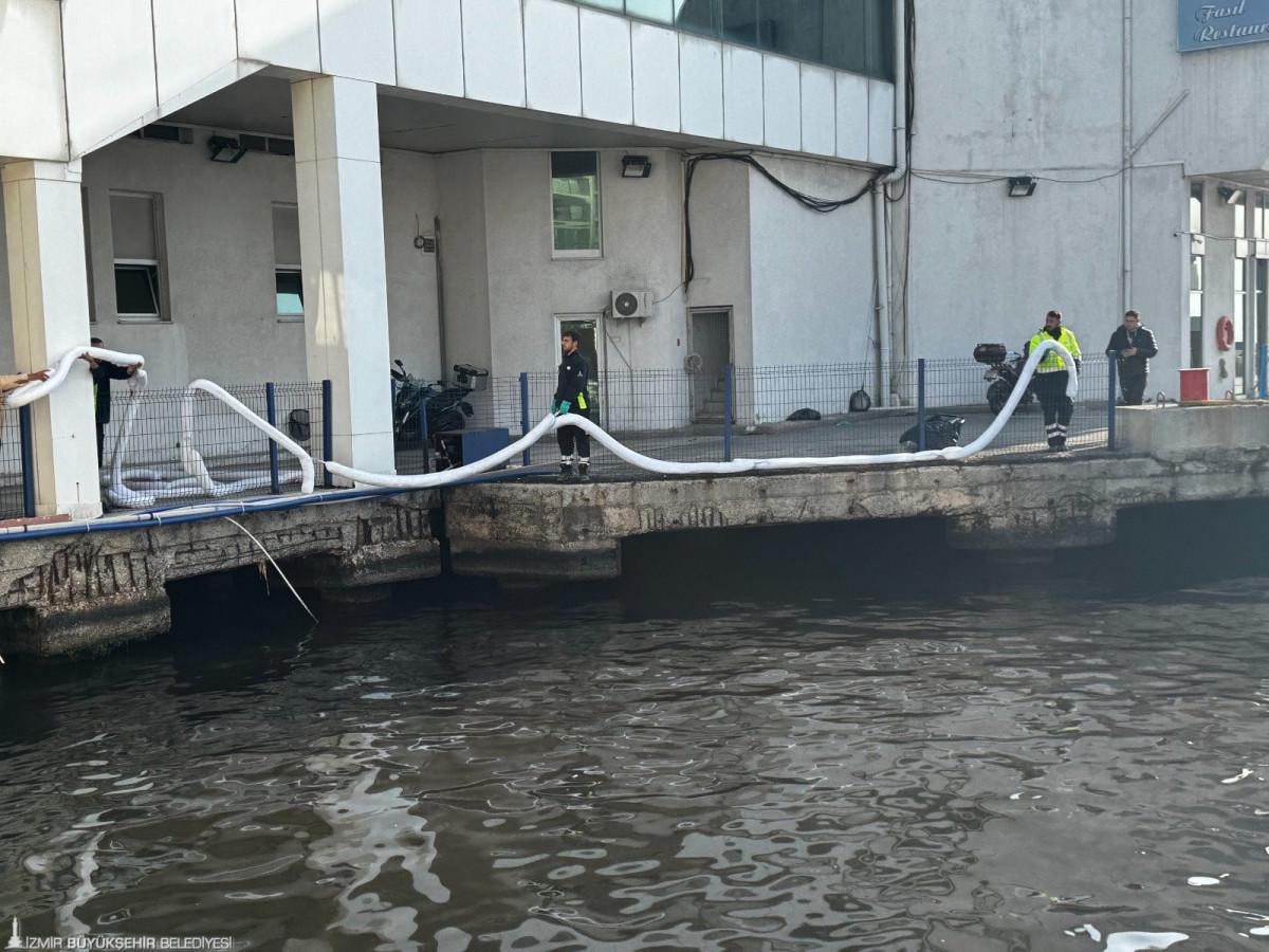 İzmir Büyükşehir Belediyesi Çevre Koruma ve Kontrol Dairesi Başkanlığı'na bağlı Deniz Koruma Şube Müdürlüğü'nün Karadan Müdahale Ekibi, bu sabah erken saatlerde yaptığı denetimler sırasında Karşıyaka Vapur İskelesi çevresinde yoğun bir yakıt kokusu ve deniz yüzeyinde siyah renkli yağ tabakası keşfetti.