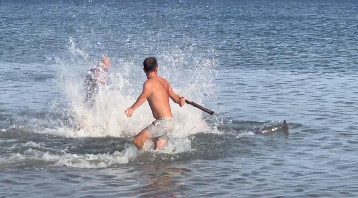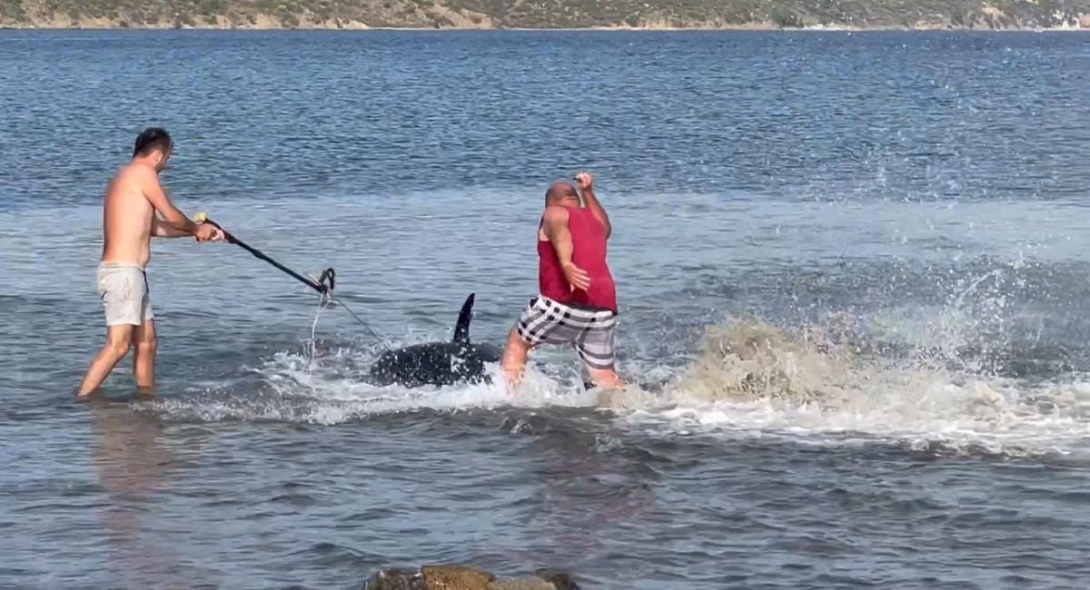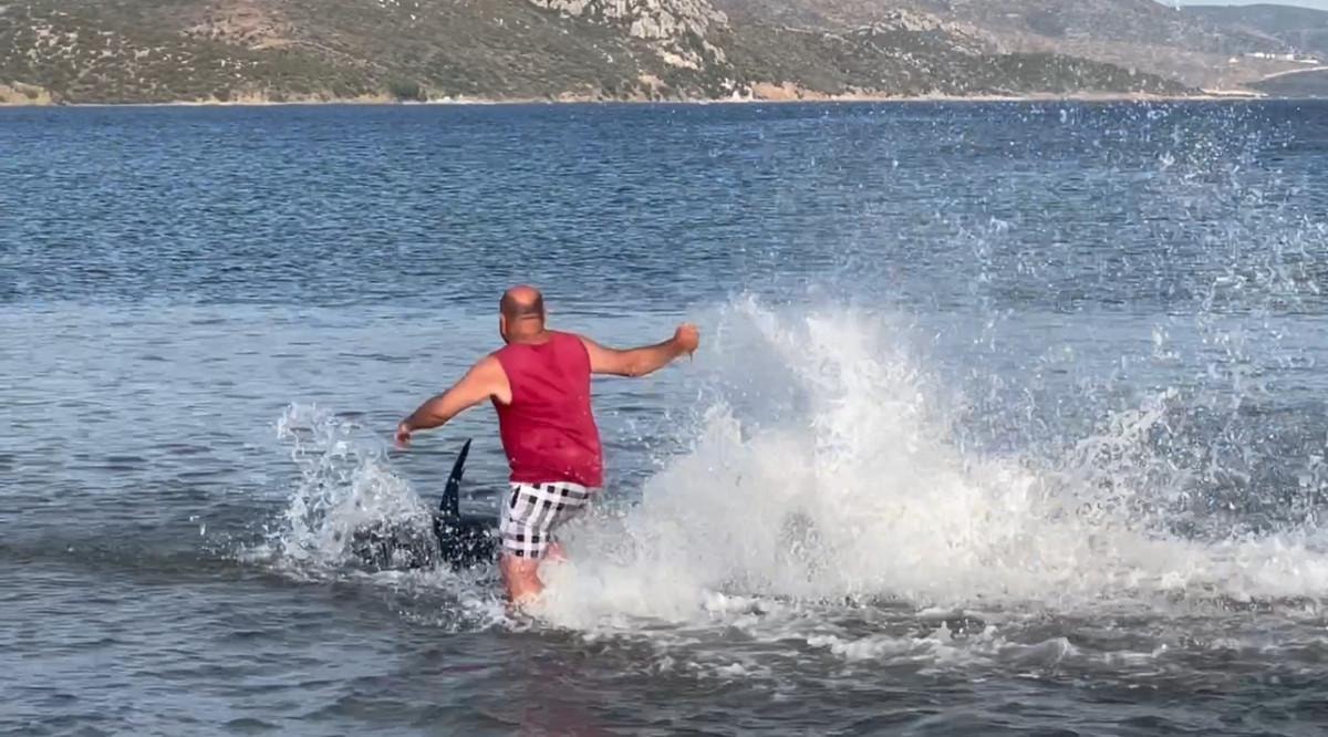 Orkinosu fark eden bir vatandaş, eline aldığı çakı ile balığı avlamaya gitti. Daha sonra başka bir vatandaş da zıpkın alarak balığın peşine düştü. Denizde orkinos ile uzun süre mücadele eden vatandaşlar, çakı ve zıpkın ile balığı avlamayı başardı. Yaşanan o anlar ise başka bir tatilci tarafından saniye saniye görüntülendi.