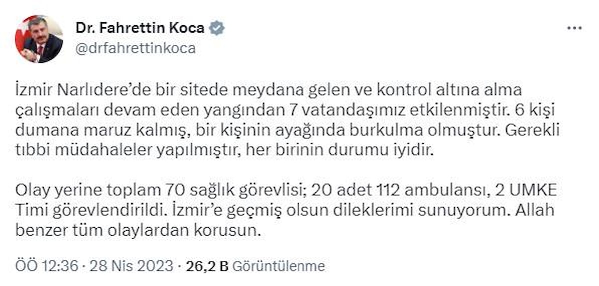 Olay yerine toplam 70 sağlık görevlisi; 20 adet 112 ambulansı, 2 UMKE Timi görevlendirildi. İzmir’e geçmiş olsun dileklerimi sunuyorum. Allah benzer tüm olaylardan korusun.