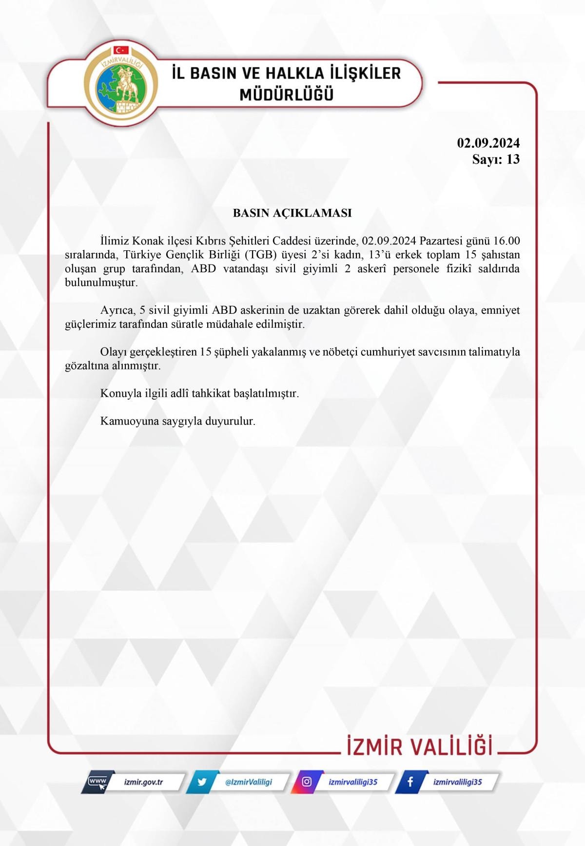 İlimiz Konak ilçesi Kıbrıs Şehitleri Caddesi üzerinde, 02.09.2024 Pazartesi günü saat 16.00 sıralarında, Türkiye Gençlik Birliği (TGB) üyesi 2'si kadın 13'ü erkek toplam 15 şahıstan oluşan grup tarafından ABD vatandaşı sivil giyimli 2 askeri personele fiziki saldırıda bulunulmuştur.