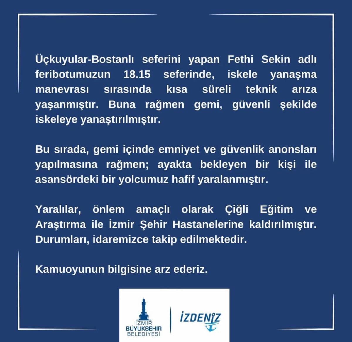 İzmir Büyükşehir Belediyesi'ne bağlı İzmir Deniz İşletmeciliği Nakliye ve Turizm Ticaret A.Ş. (İZDENİZ), kazayla ilgili açıklama yaptı.