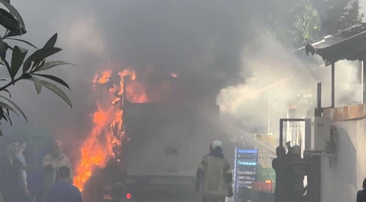 İzmir'de Konak ilçesinde saat 18.00 sıralarında Eski İzmir Caddesi üzerindeki bir marketin arka bahçesinde park halinde bulunan kamyon, henüz belirlenemeyen nedenle yanmaya başladı.