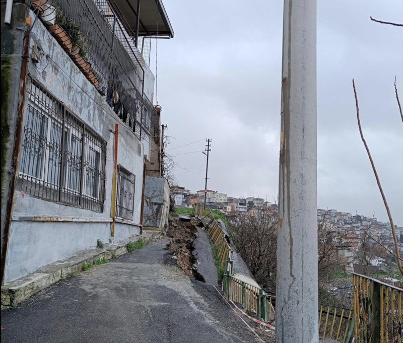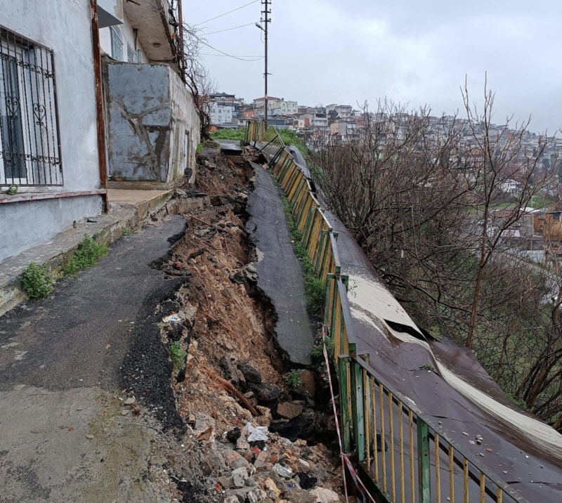 Konak'ta, sağanak sonrası zemini yumuşayan yamaçtaki asfalt yol, kısmen çöktü. Çevresindeki iki ev, çökme tehlikesiyle karşı karşıya kalırken çöken yol trafiğe kapatıldı.