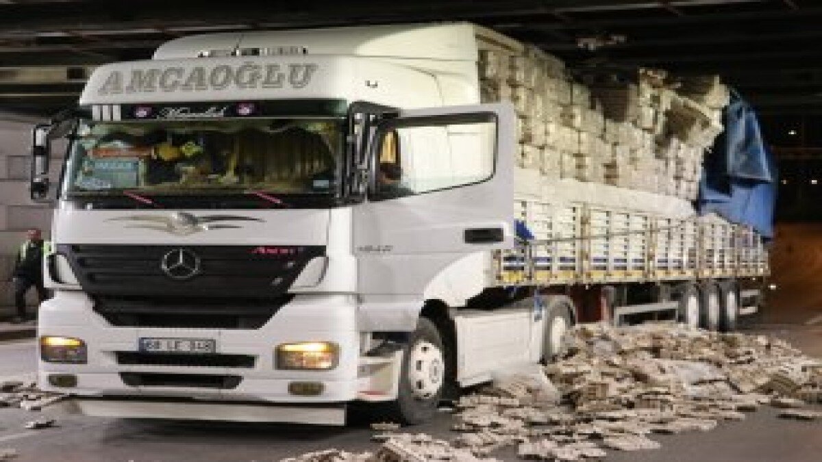 İzmir'in Konak ilçesindeki Cumhuriyet Bulvarı'nda, boş yumurta kolisi yüklü 68 LB 633 plakalı tır, 4 metre yüksekliğindeki alt geçidin tavanına çarptı.