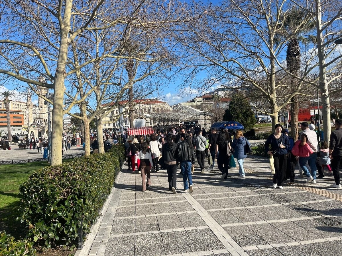 Güneşli havayı fırsat bilen vatandaşlar, özellikle Konak Atatürk Meydanı ile sahil bandına akın etti. Yürüyüş yapan, deniz havası alan ve açık alanlarda vakit geçiren İzmirliler, kent merkezinde kalabalık görüntüler oluşturdu. Hafta sonu tatilinin de etkisiyle ana arterlerde yaya yoğunluğu dikkat çekti.