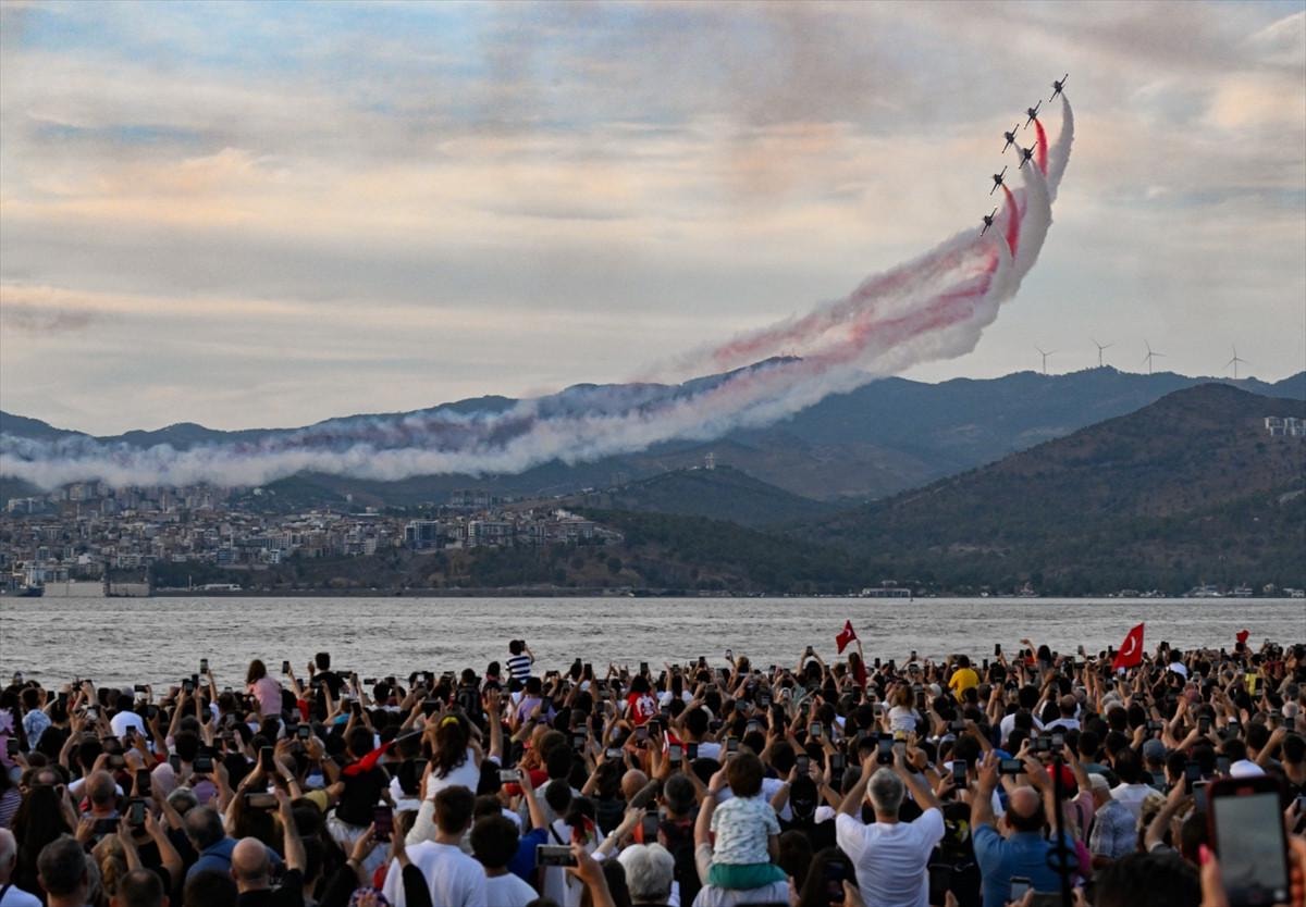 Birliklerin geçişinin ardından, "Solo Türk" ve "Türk Yıldızları", İzmir semalarında gösteri uçuşu gerçekleştirdi. Birinci Kordon ve Gündoğdu Meydanı'nı dolduran İzmirliler, gösterileri ilgiyle izledi.