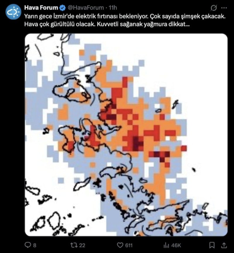 “İzmir'de elektrik fırtınası bekleniyor. Çok sayıda şimşek çakacak. Hava çok gürültülü olacak. Kuvvetli sağanak yağmura dikkat…”