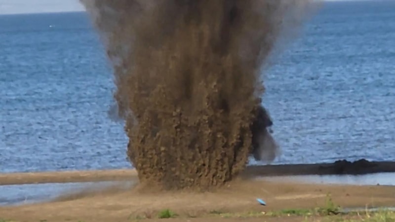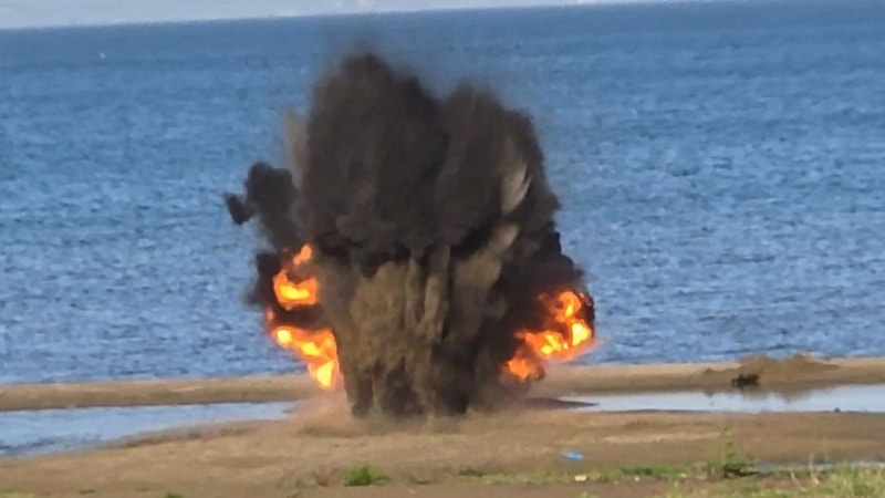 Ekipler çevre güvenliğini alarak vatandaşları sahil şeridinden uzaklaştırırken, olay yerine gelen özel kıyafetli bomba imha ekibi, fünye ile top mermisini imha etti.