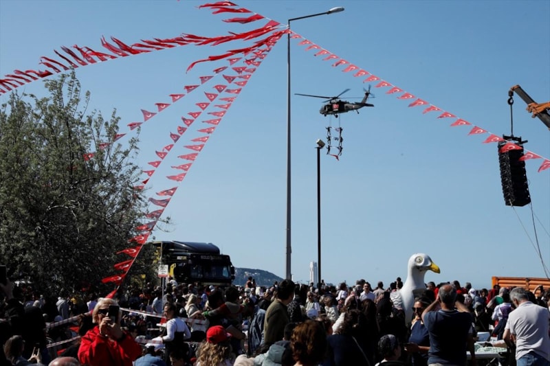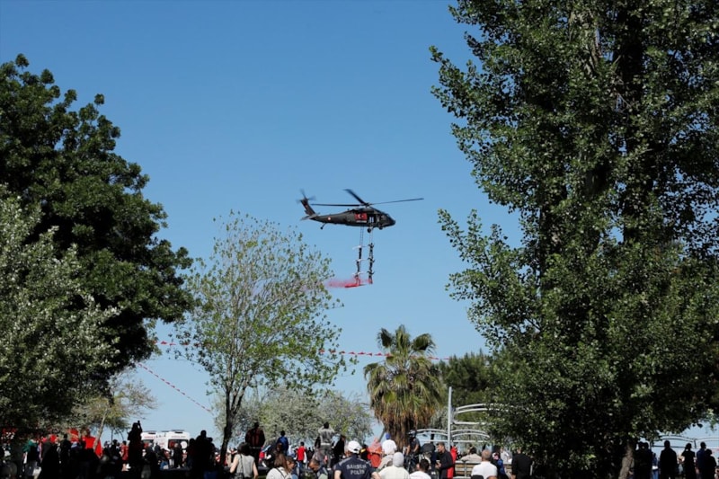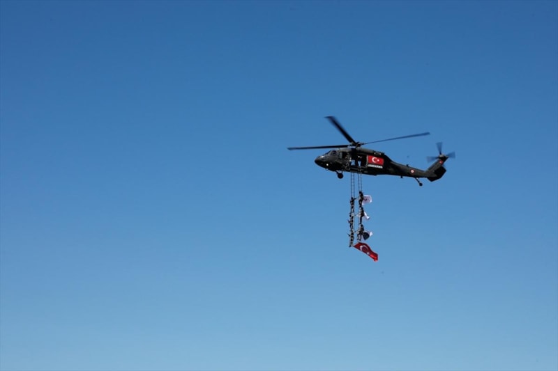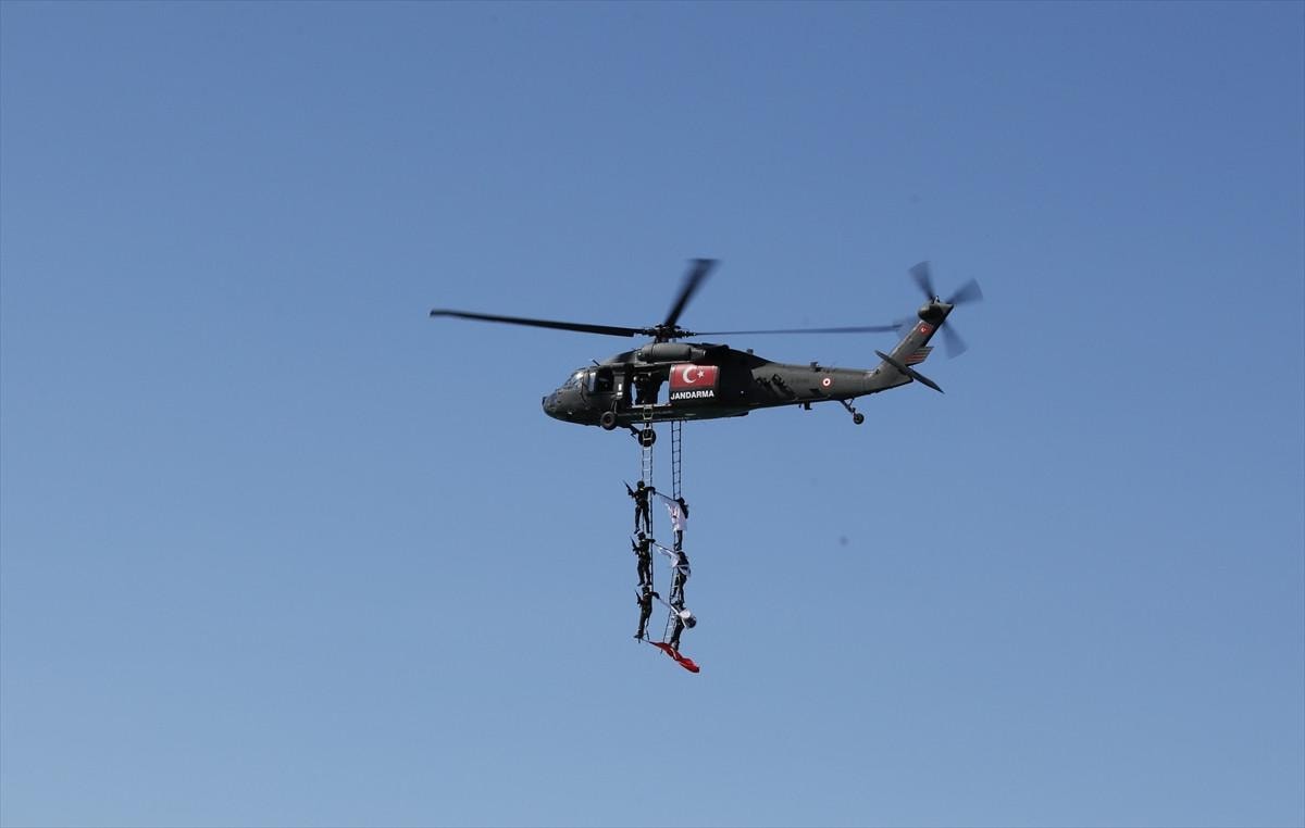 Jandarma Genel Komutanlığı Havacılık Başkanlığı’na bağlı helikopterler, gökyüzünde sergiledikleri manevralarla izleyenlere unutulmaz anlar yaşattı. Gösteriler sırasında Jandarma Özel Asayiş Komutanlığı’na bağlı tim, helikopterden halatlarla inerek "üzüm salkımı" olarak bilinen özel bir formasyonda iniş gerçekleştirdi ve Türk bayrağını açarak halkı selamladı.