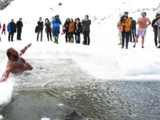 3 saat yürüyerek zirveye ulaşan doğaseverler gölün buz tutan yüzeyini kırdı,1 derecedeki suda yüzdü. Sıra dışı etkinliği ilgiyle izleyen çok sayıda kişi o anları görüntüledi.
