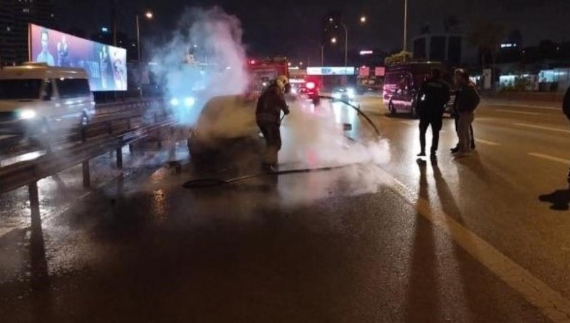 Alevler kısa sürede büyüyerek bütün otomobili sardı. Durumu fark eden otomobil sürücüsü aracı emniyet şeridine çekerek araçtan çıktı.