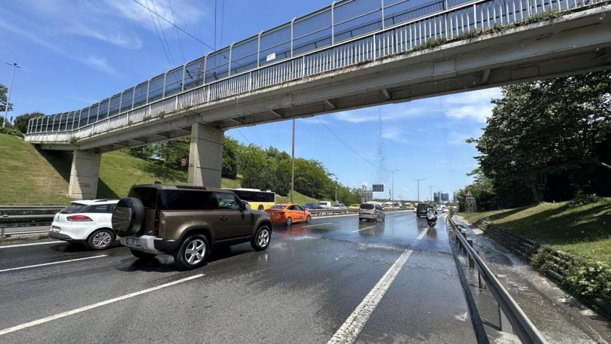 Bağlantı yolundaki bir üst geçitte su borularının patlaması sonucu çok miktarda su otoyola akmaya başladı.
