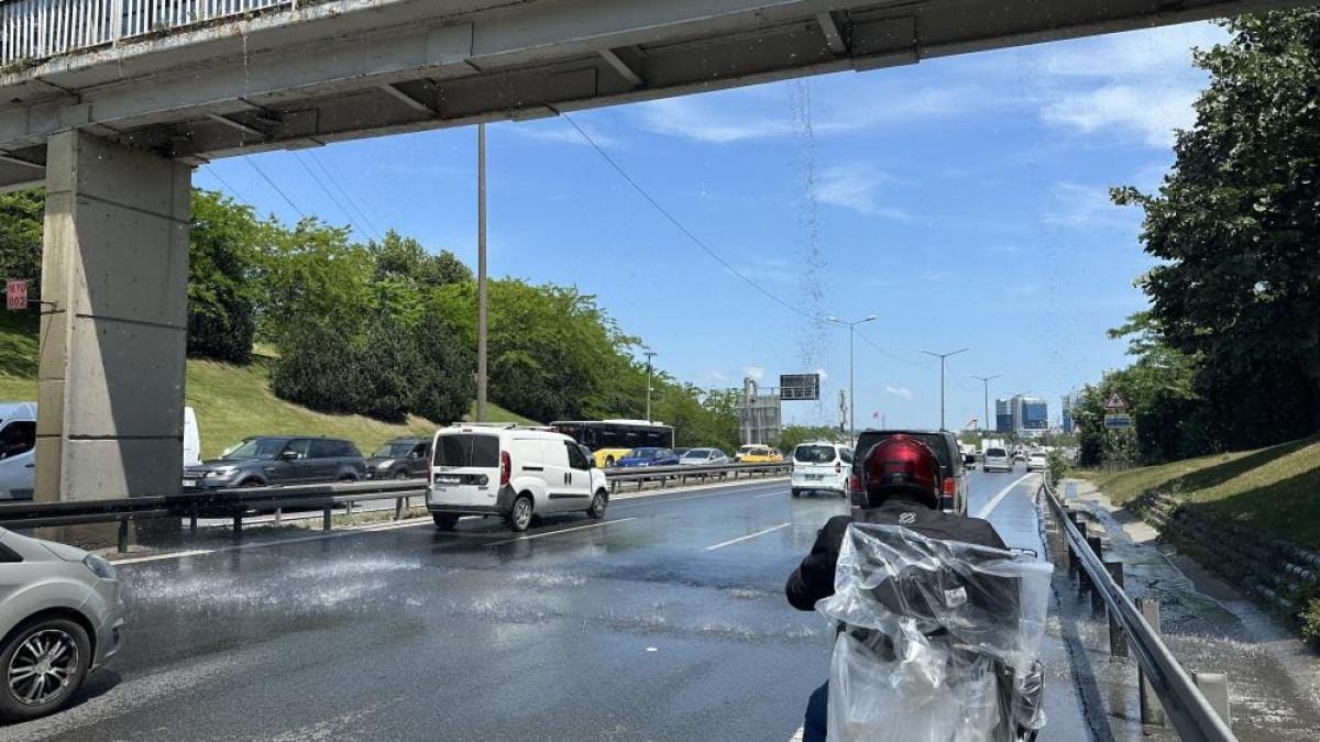 Üst geçitten adeta yağmur gibi akan sular nedeniyle sürücüler önce şaşırdı. Bazı sürücüler de yavaşlayarak araçlarını yıkadı.