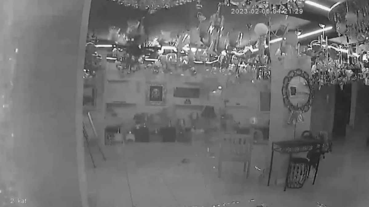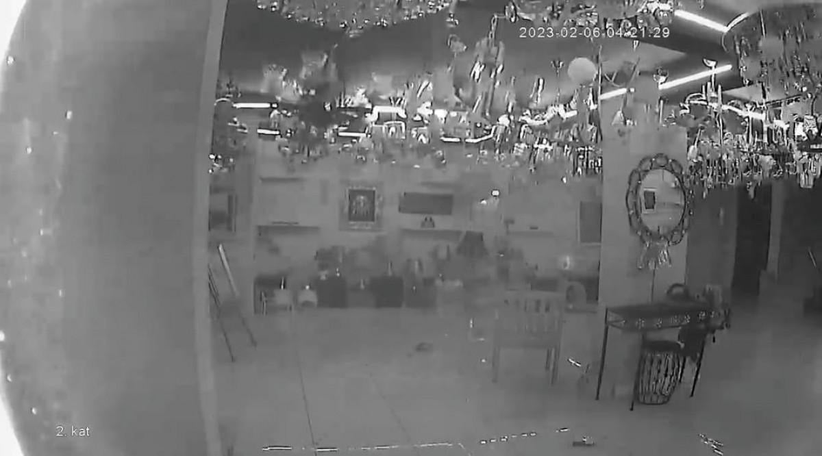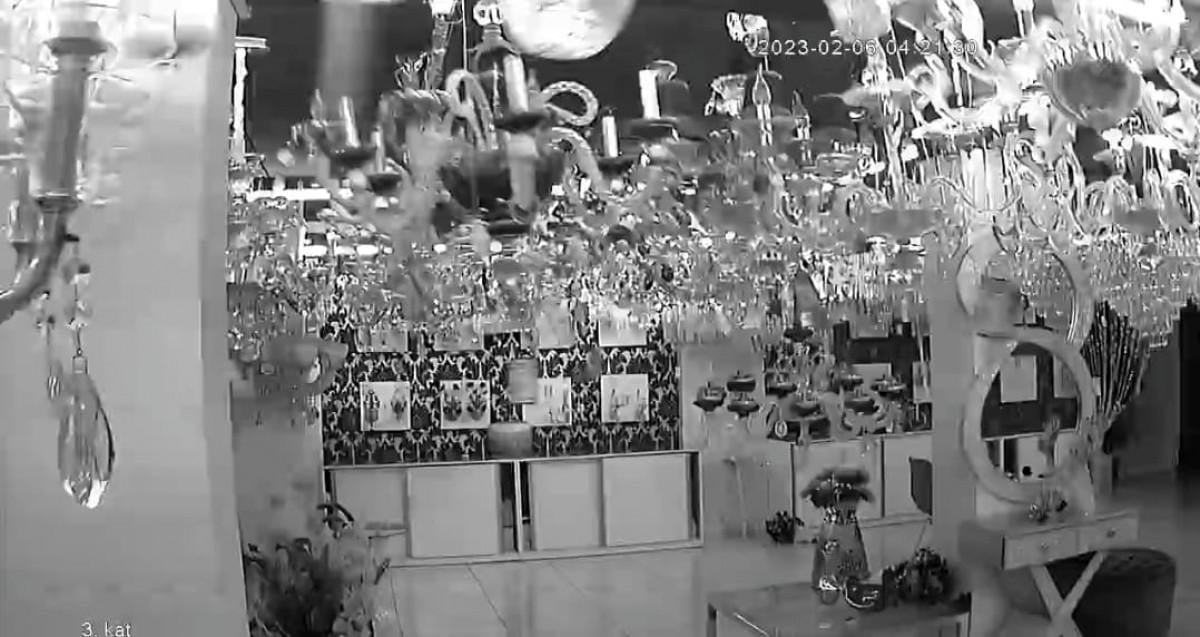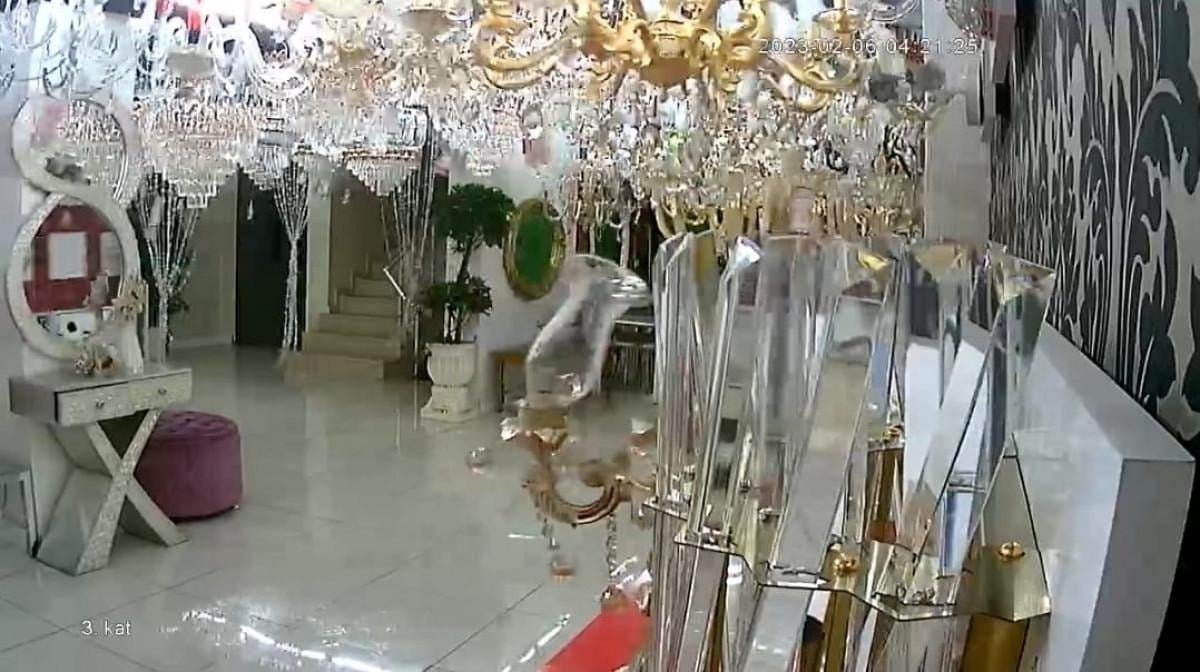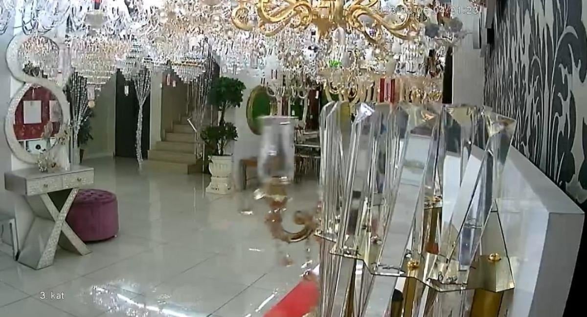 Kentin Onikişubat ilçesi Yusuflar Mahallesi Şekerdere Bulvarı'nda bulunan avize dükkanında ise deprem anı güvenlik kamerasına yansıdı.