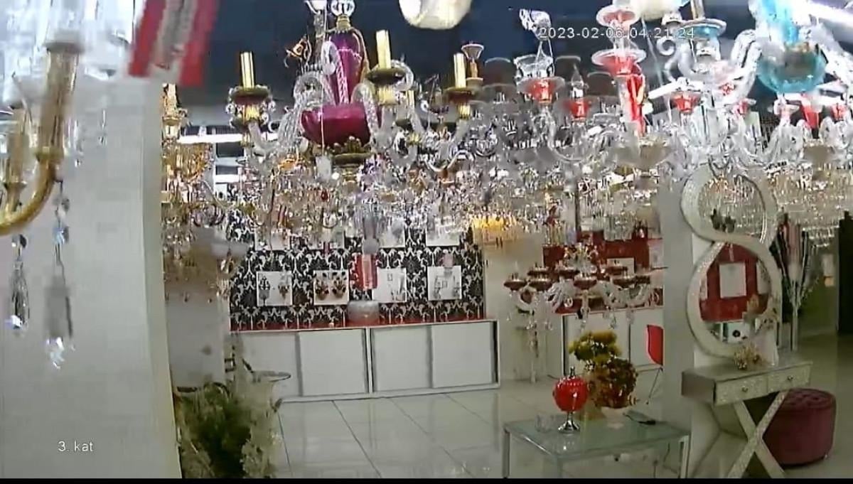 Avize dükkanında tavana asılı onlarca avize deprem anında sallanırken hiç biri yere düşmedi.