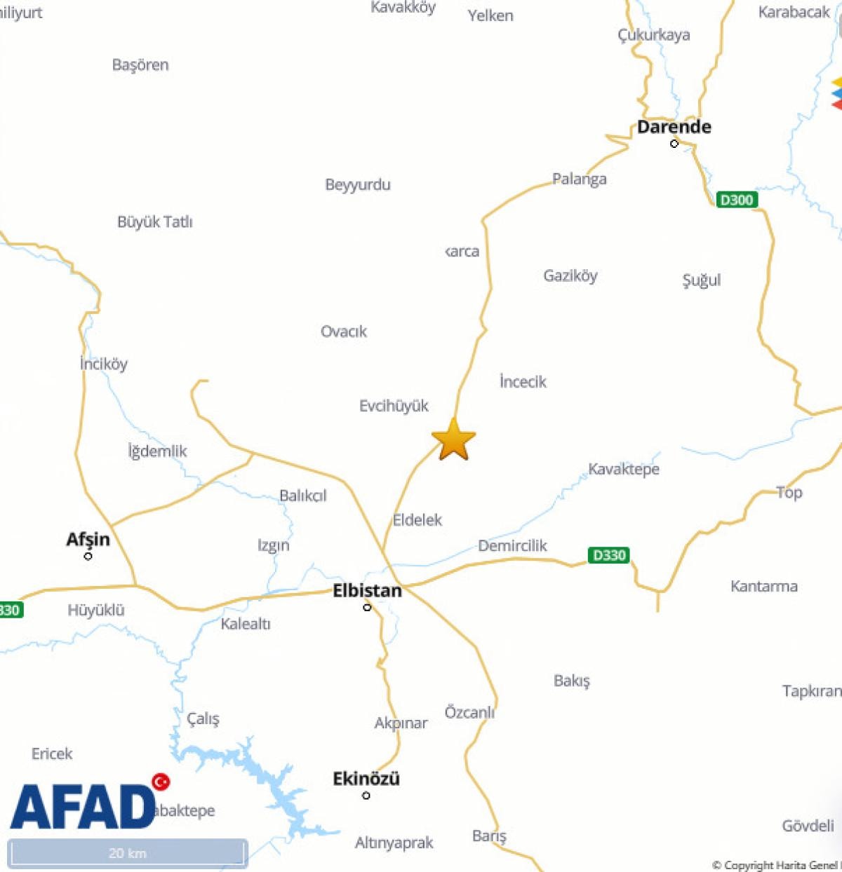 Depremin merkez üssü olarak Elbistan işaret edildi.