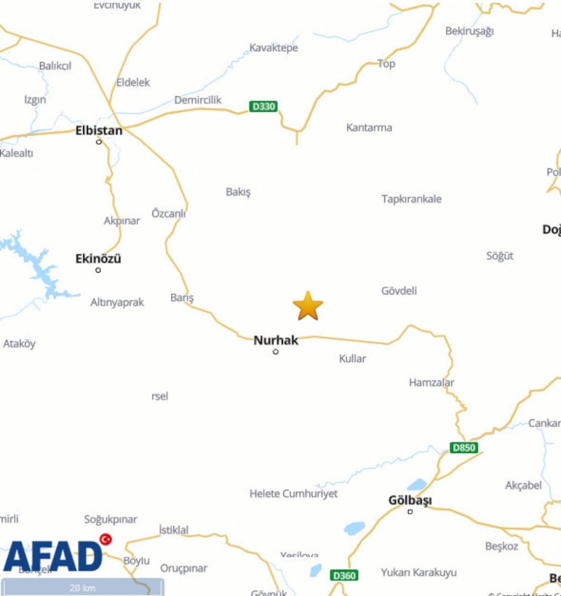 Depremin merkez üssü olarak Nurhak işaret edildi.