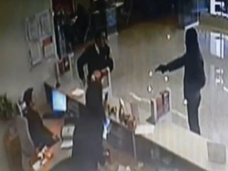 Görüntülerde Mehmet Y.'nin kar maskeli şekilde elinde tabancayla girdiği bankadaki güvenlik görevlisi A.T.'den tabancasını gişeye bıraktırıp uzaklaştırdıktan sonra gişe çalışanı kadından poşet içerisinde 27 bin 500 lira ile güvenlik görevlisinin tabancasını alıp kaçtığı görülüyor.